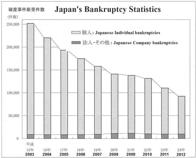 Note: In the US 816,271 individuals filed for personal bankruptcy under Chapter 7 in 2012 versus 92,552 ‘equivalent’ filings in Japan.