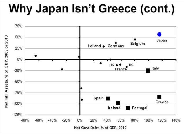 Katz: The point at which Japan is in danger of capital flight, like Greece, is when Japan’s current account becomes chronically in deficit. Some people say that could be five or ten years from now. I think it will be later — I’m not even sure it’s going to happen. Japan will most likely become a chronic trade deficit country within this decade, but the current account is different. The current account is the sum of Japan’s trade balance plus the income earned on Japan’s overseas assets (profits of overseas subsidiaries as well as stocks and bonds held outside Japan). Japan is not vulnerable now because it runs a big current account surplus. Even though the trade balance has been in deficit so far this year, the current account is still in surplus and will remain so for some time to come. If and when Japan does turn into a chronic deficit country, that would be a game-changer which would gradually raise the now-tiny risk of a Greek type crisis. But it would not spark an immediate crisis because Japan has a cushion of $3.3 trillion in net overseas assets.